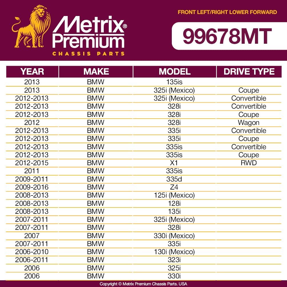 | Manufacturer Warranty Description | All Metrix Premium Chassis Parts come with a 3 Year / 36,000 miles Limited Warranty from date of installation. |