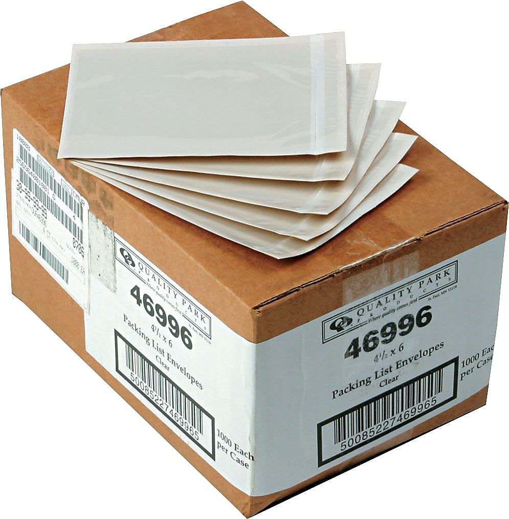Clear window under preprinted notation allows shipping papers to show through and serve as Address label. Moisture resistant—protects enclosures from spills or inclement weather. Permanent adhesive keeps packing list secure to prevent lost shipping documents.